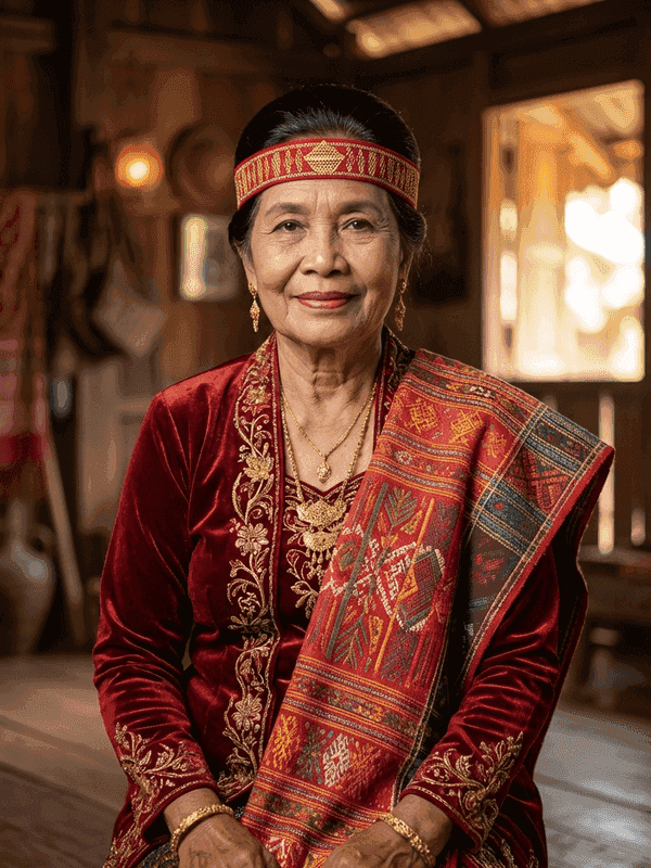 Pakaian adat wanita Batak sangat elegan dengan dominasi kain ulos yang ditenun dengan motif khas.